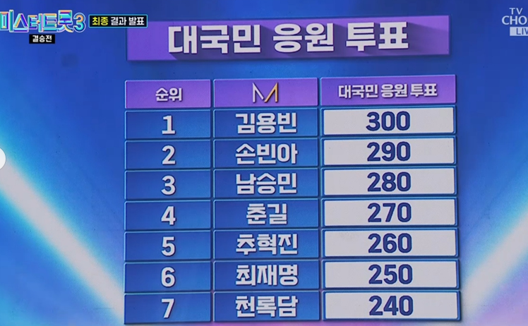 김용빈은 7주 연속 대국민 응원투표 1위를 기록하며 꾸준한 인기를 증명했습니다. 결승전에서도 그의 뛰어난 실력과 매력으로 공동 1위라는 좋은 성적을 거두었습니다.