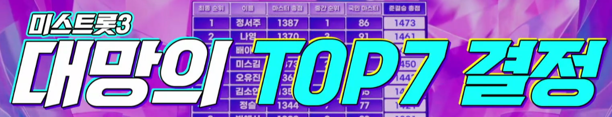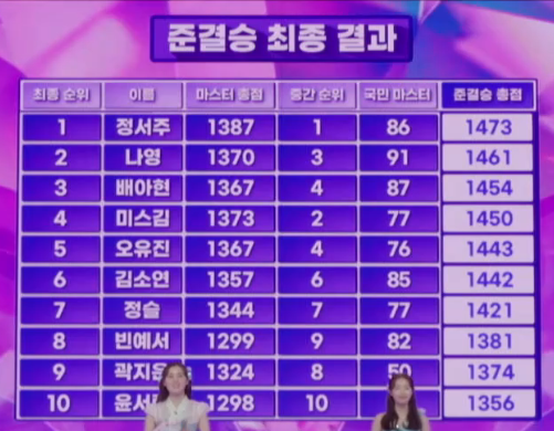 1위 정서주, 2위 나영, 3위 배아현, 4위 미스김, 5위 오유진, 6위 김소연, 7위 정슬,